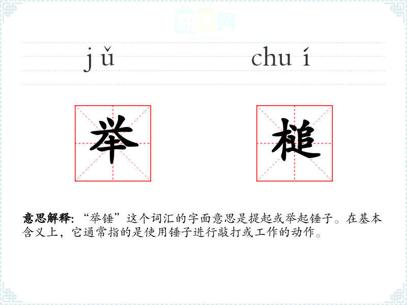 - 专业领域:在建筑或制造业中,“举锤”是一个常见的动作,用于描述工人进行具体工作的步骤。