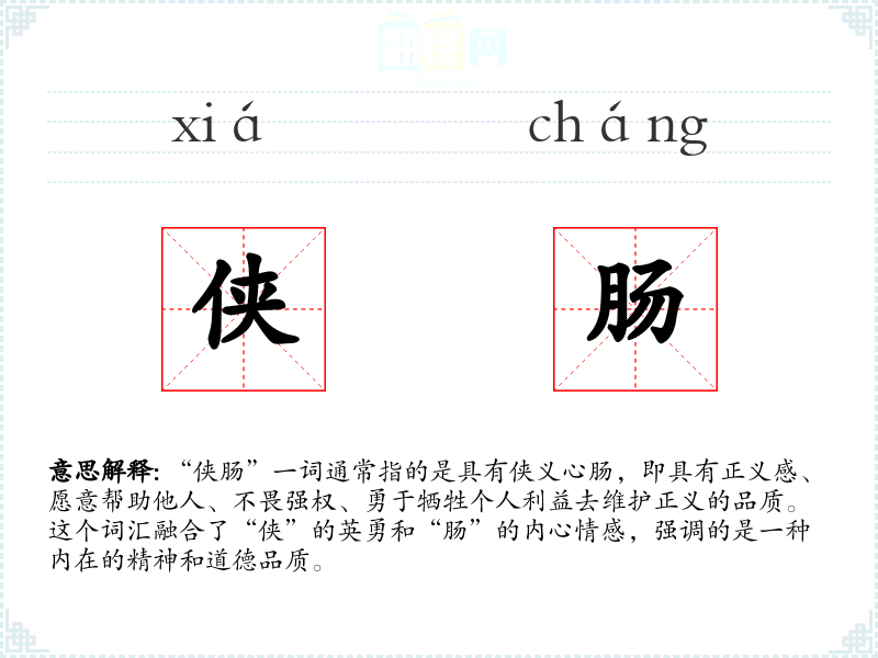 “侠肠”一词通常指的是具有侠义心肠,即具有正义感、愿意帮助他人、不畏强权、勇于牺牲个人利益去维护正义的品质。这个词汇融合了“侠”的英勇和“肠”的内心情感,强调的是一种内在的精神和道德品质。