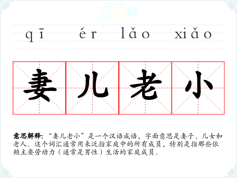 “妻儿老小”是一个汉语成语,字面意思是妻子、儿女和老人。这个词汇通常用来泛指家庭中的所有成员,特别是指那些依赖主要劳动力(通常是男性)生活的家庭成员。