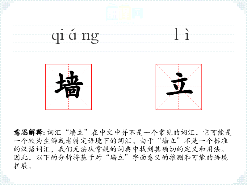 在其他语言中,可能没有直接对应“墙立”的词汇,但类似的表达可以通过组合相应的词汇来实现。