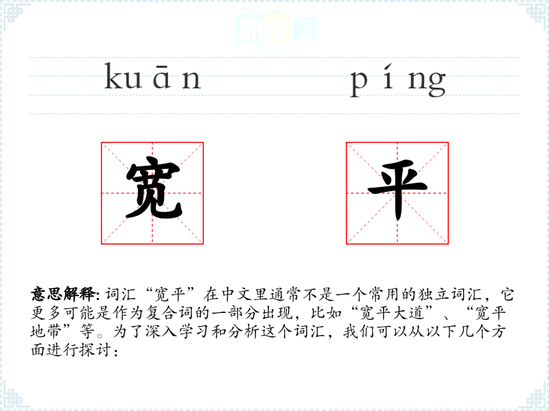 词汇“宽平”在中文里通常不是一个常用的独立词汇,它更多可能是作为复合词的一部分出现,比如“宽平大道”、“宽平地带”等。为了深入学习和分析这个词汇,我们可以从以下几个方面进行探讨: