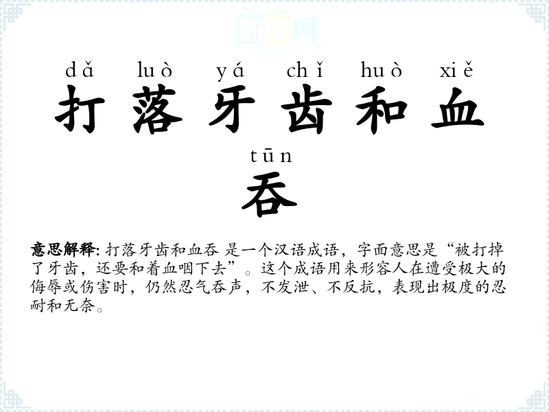 打落牙齿和血吞 是一个汉语成语,字面意思是“被打掉了牙齿,还要和着血咽下去”。这个成语用来形容人在遭受极大的侮辱或伤害时,仍然忍气吞声,不发泄、不反抗,表现出极度的忍耐和无奈。