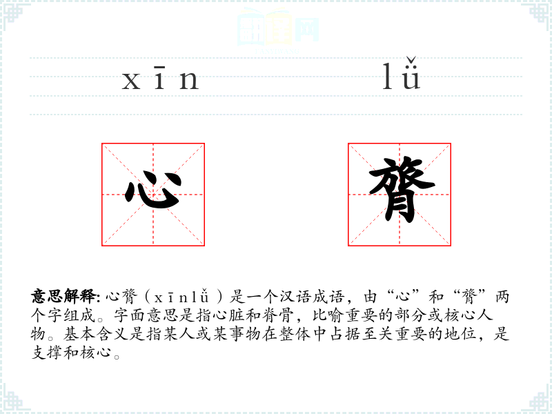 心膂(xīn lǚ)是一个汉语成语,由“心”和“膂”两个字组成。字面意思是指心脏和脊骨,比喻重要的部分或核心人物。基本含义是指某人或某事物在整体中占据至关重要的地位,是支撑和核心。