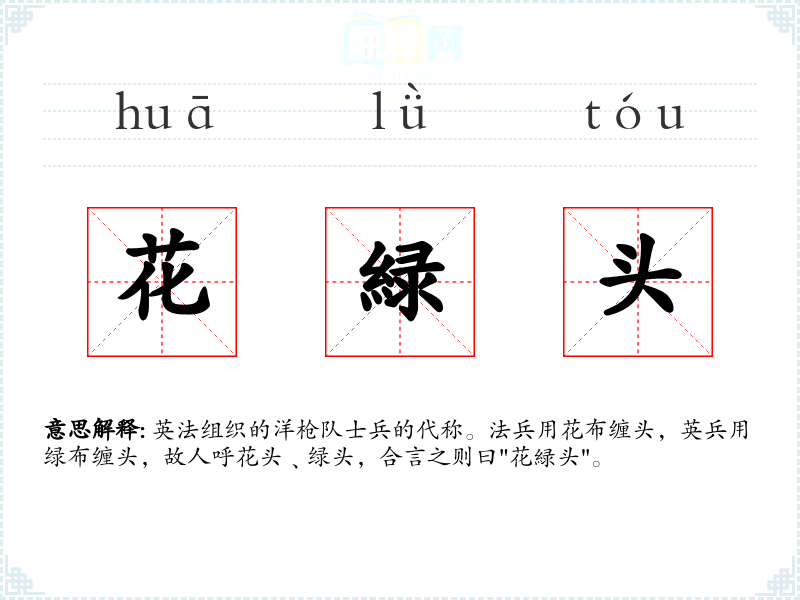 英法组织的洋枪队士兵的代称。法兵用花布缠头,英兵用绿布缠头,故人呼花头﹑绿头,合言之则曰"花緑头"。