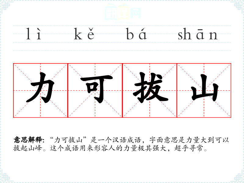 “力可拔山”是一个汉语成语,字面意思是力量大到可以拔起山峰。这个成语用来形容人的力量极其强大,超乎寻常。