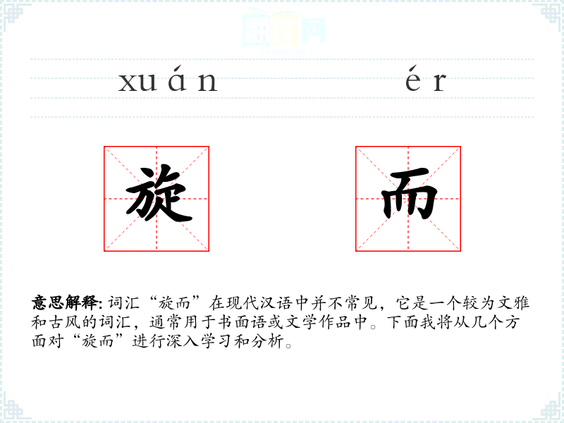 词汇“旋而”在现代汉语中并不常见,它是一个较为文雅和古风的词汇,通常用于书面语或文学作品中。下面我将从几个方面对“旋而”进行深入学*和分析。