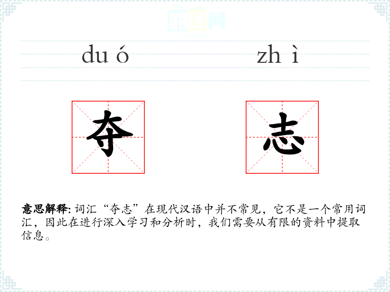 词汇“夺志”在现代汉语中并不常见,它不是一个常用词汇,因此在进行深入学*和分析时,我们需要从有限的资料中提取信息。