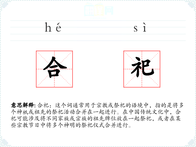 合祀:这个词通常用于或祭祀的语境中,指的是将多个神祇或祖先的祭祀活动合并在一起进行。在传统文化中,合祀可能涉及将不同家族或宗族的祖先牌位放在一起祭祀,或者在某些**节日中将多个神明的祭祀仪式合并进行。