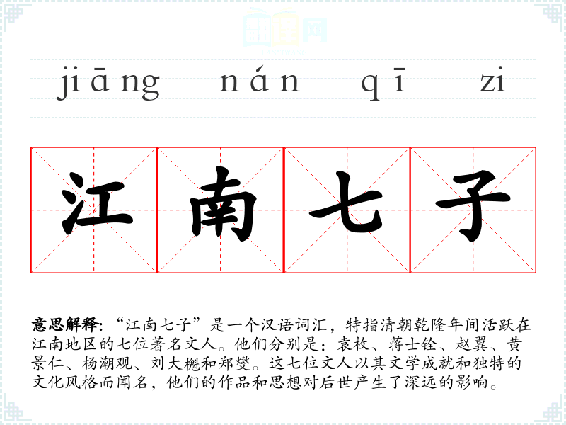 “江南七子”是一个汉语词汇,特指清朝乾隆年间活跃在江南地区的七位著名文人。他们分别是:袁枚、蒋士铨、赵翼、黄景仁、杨潮观、刘大櫆和郑燮。这七位文人以其文学成就和独特的文化风格而闻名,他们的作品和思想对后世产生了深远的影响。