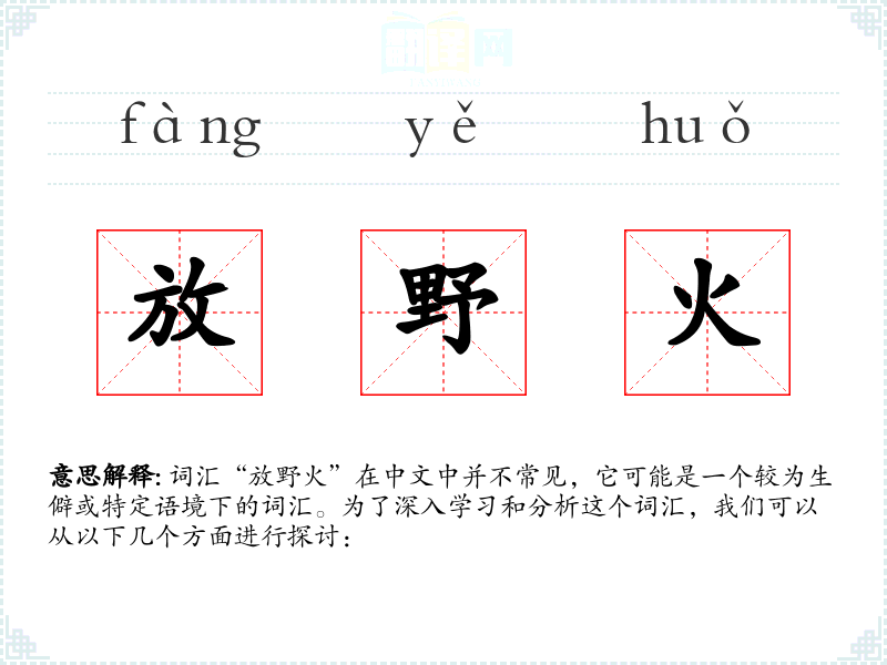 词汇“放野火”在中文中并不常见,它可能是一个较为生僻或特定语境下的词汇。为了深入学习和分析这个词汇,我们可以从以下几个方面进行探讨: