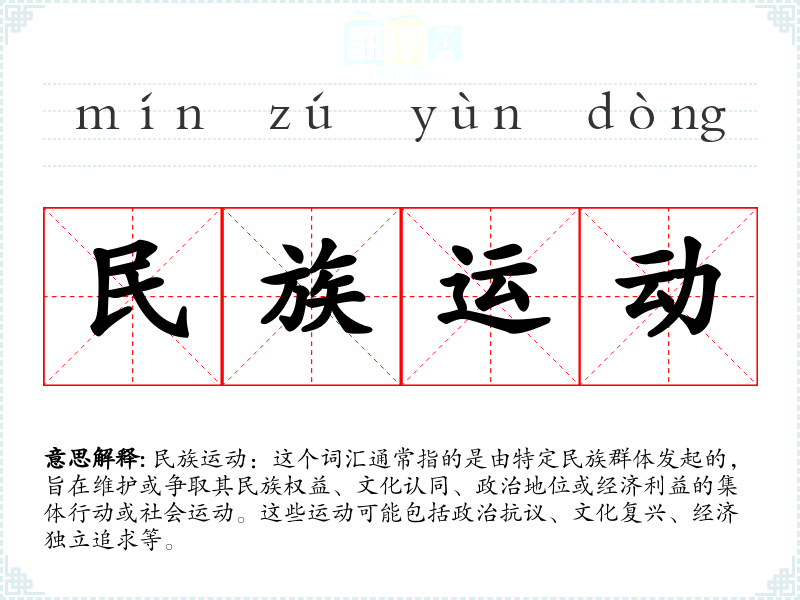 民族**:这个词汇通常指的是由特定民族群体发起的,旨在维护或争取其民族权益、文化认同、政治地位或经济利益的集体行动或社会。这些可能包括政治抗议、文化复兴、经济独立追求等。