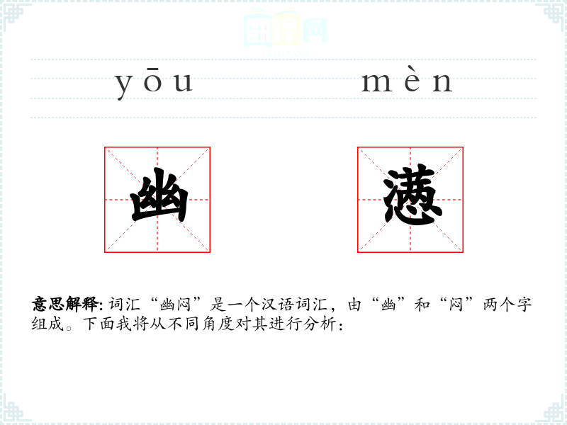 词汇“幽闷”是一个汉语词汇,由“幽”和“闷”两个字组成。下面我将从不同角度对其进行分析: