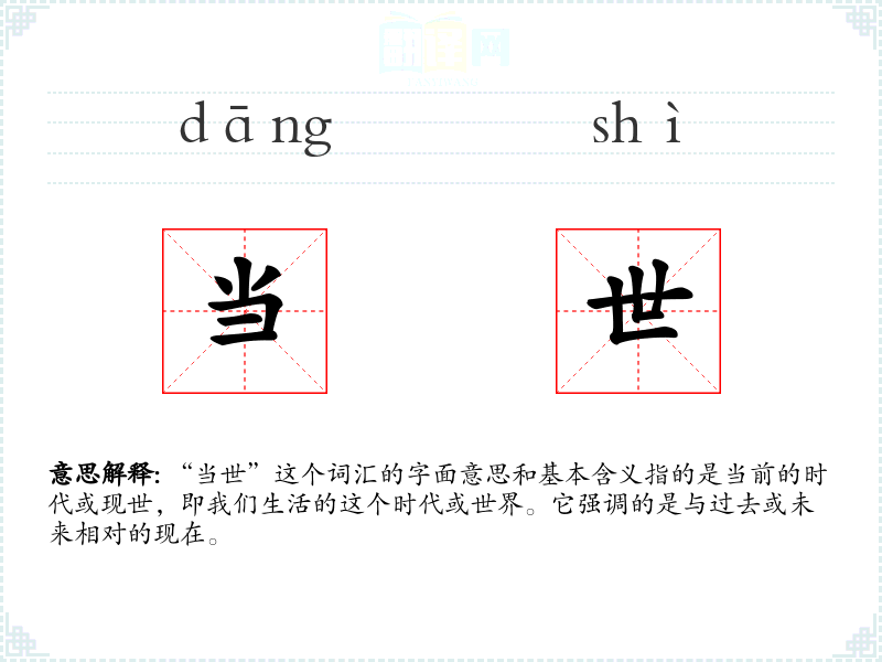 “当世”这个词汇的词源可以追溯到古代汉语,其中“当”字有“在”或“处于”的意思,“世”字指“时代”或“世界”。随着时间的推移,“当世”逐渐固定为指代当前时代的词汇。