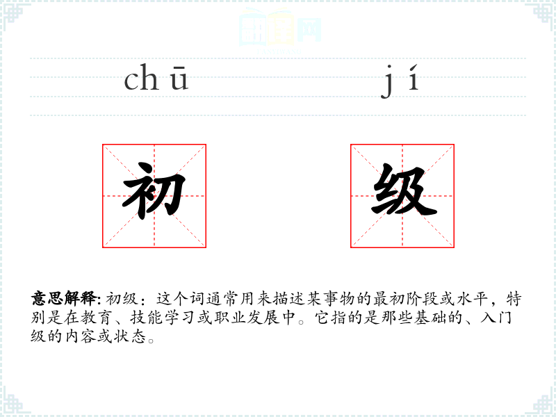“初级”这个词源于汉语,由“初”和“级”两个字组成。“初”意味着开始或最初,“级”则表示等级或层次。在现代汉语中,这个词的使用范围逐渐扩大,涵盖了教育、职业等多个领域。