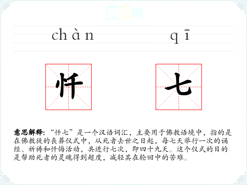 “忏七”是一个汉语词汇,主要用于语境中,指的是在徒的丧葬仪式中,从死者去世之日起,每七天举行一次的诵经、祈祷和忏悔活动,共进行七次,即四十九天。这个仪式的目的是帮助死者的灵魂得到超度,减轻其在轮回中的苦难。
