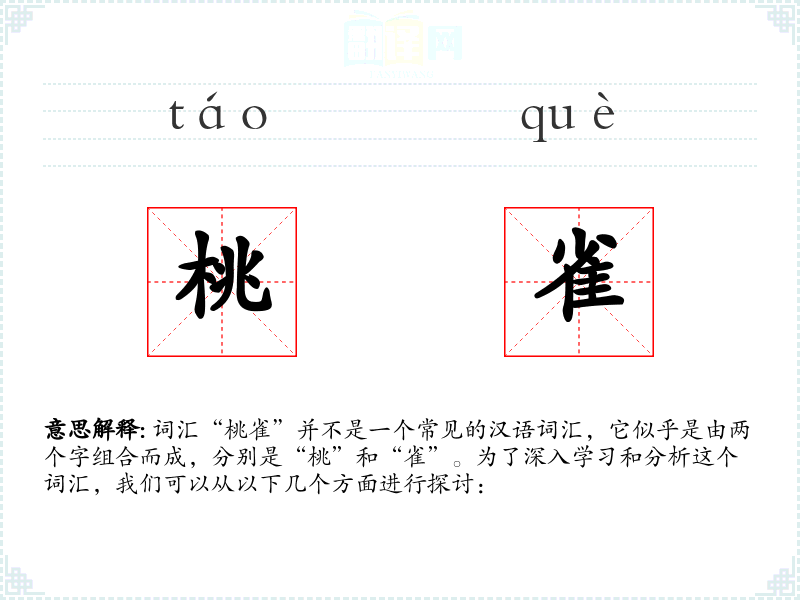 - 反义词:由于“桃雀”不是一个标准词汇,反义词可能不适用。