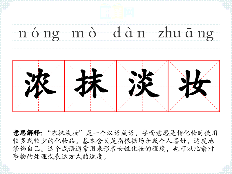在文学中,“浓抹淡妆”常用来形容女性的妆容,如“她今天浓抹淡妆,显得格外迷人。”在口语中,这个成语可以用来形容任何事物的适度处理,如“这篇文章浓抹淡妆,既不过于简略也不过于繁琐。”在专业领域,如美容行业,这个成语可以用来指导化妆技巧。