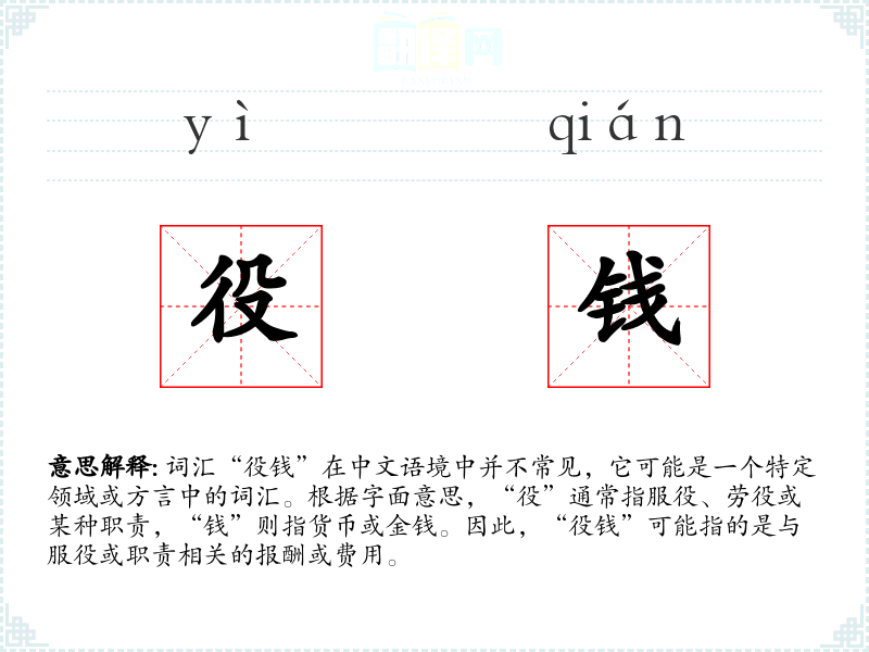 - 词源:“役”源自古代汉语,指服役或职责;“钱”源自古代货币单位。
