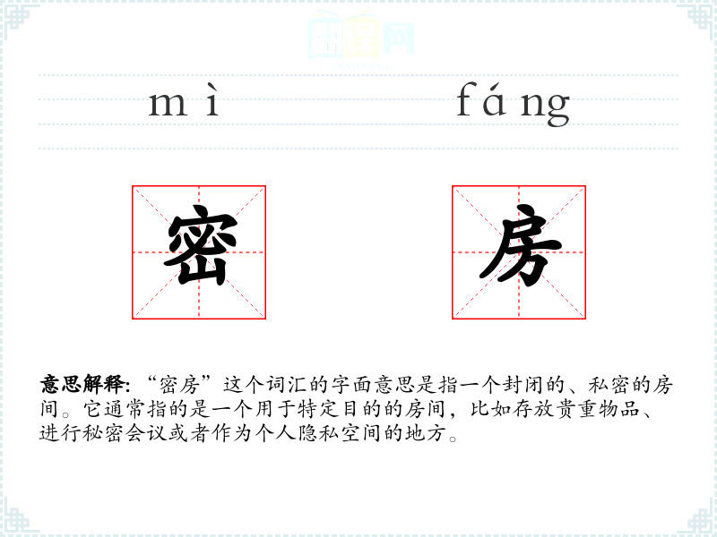 “密房”这个词汇的字面意思是指一个封闭的、私密的房间。它通常指的是一个用于特定目的的房间,比如存放贵重物品、进行秘密会议或者作为个人隐私空间的地方。