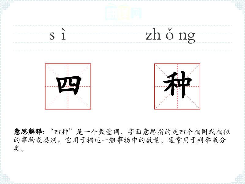 “四种”是一个数量词,字面意思指的是四个相同或相似的事物或类别。它用于描述一组事物中的数量,通常用于列举或分类。