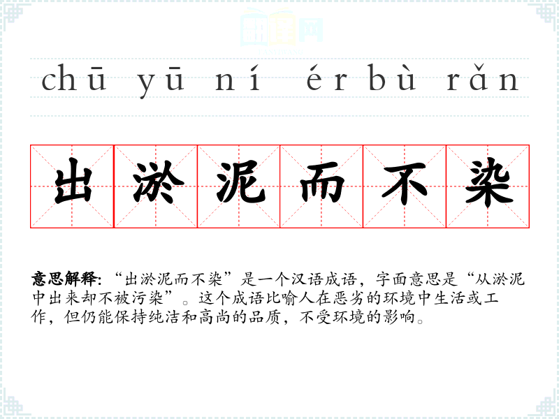 这个成语出自宋代周敦颐的《爱莲说》:“予独爱莲之出淤泥而不染,濯清涟而不妖。”原文用来赞美莲花的纯洁和高洁,后来被广泛用来比喻人的品质。