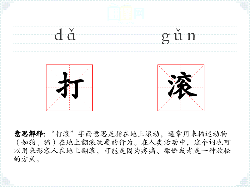 “打滚”字面意思是指在地上滚动,通常用来描述动物(如狗、猫)在地上翻滚玩耍的行为。在人类活动中,这个词也可以用来形容人在地上翻滚,可能是因为疼痛、撒娇或者是一种放松的方式。