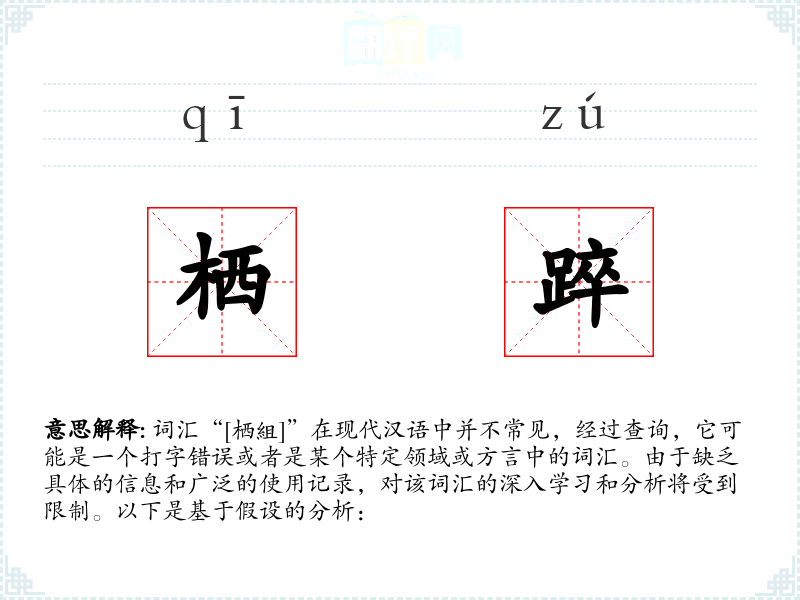词汇“[栖組]”在现代汉语中并不常见,经过查询,它可能是一个打字错误或者是某个特定领域或方言中的词汇。由于缺乏具体的信息和广泛的使用记录,对该词汇的深入学习和分析将受到限制。以下是基于假设的分析: