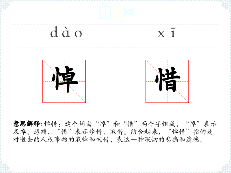 悼惜:这个词由“悼”和“惜”两个字组成,“悼”表示哀悼、悲痛,“惜”表示珍惜、惋惜。结合起来,“悼惜”指的是对逝去的人或事物的哀悼和惋惜,表达一种深切的悲痛和遗憾。