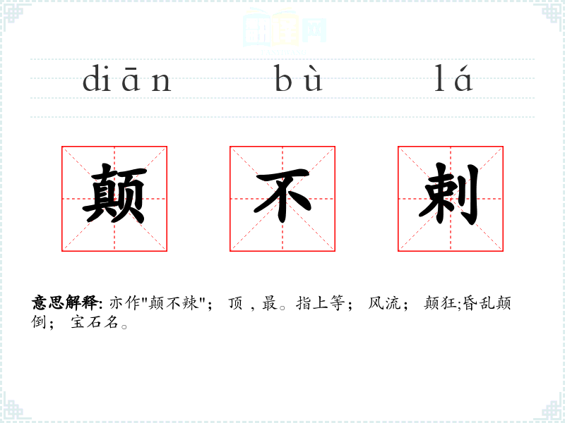 亦作"颠不辣"; 顶﹐最。指上等; 风流; 颠狂;昏乱颠倒; 宝石名。