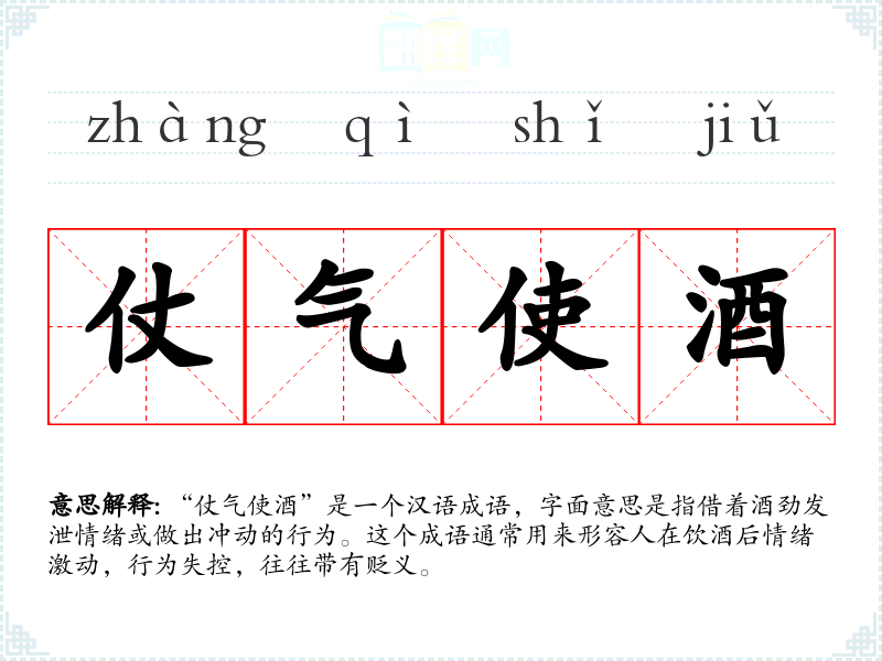 在文学作品中,“仗气使酒”常用来描绘人物在酒后失去理智,做出一些平时不会做的冲动行为,如争吵、打架等。在口语中,这个成语可以用来形容某人在饮酒后的行为变得鲁莽或失控。在专业领域,如心理学或社会学,这个词汇可能被用来讨论酒精对情绪和行为的影响。