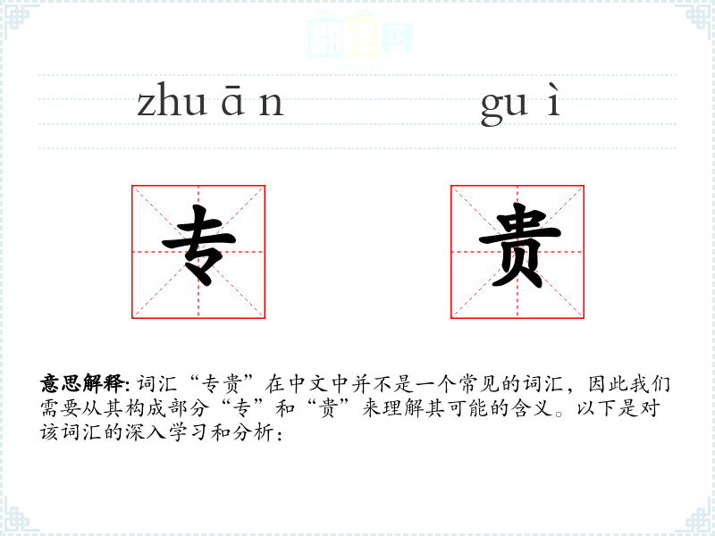 - 词源:由于“专贵”不是一个常用词汇,其词源不明确,可能是由“专”和“贵”两个常用词汇组合而成。