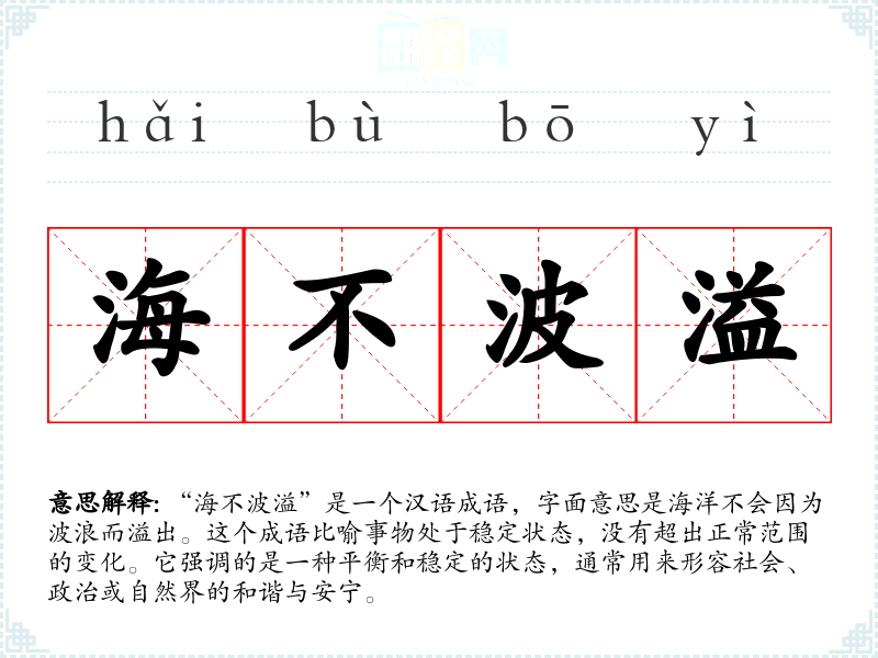 在**传统文化中,稳定和和谐是非常重要的价值观。因此,“海不波溢”这个成语在描述国家治理、社会秩序和个人心态时,都体现了这种追求稳定和谐的文化背景。