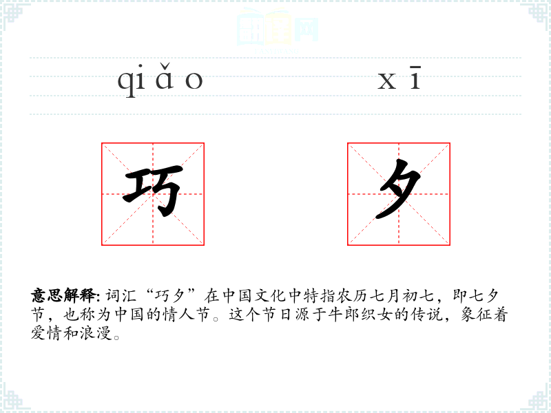 “巧夕”字面意思是“巧妙的夜晚”,特指七夕节这一晚。在这一天,传说中的牛郎和织女会在银河上相会,因此这个节日也象征着爱情的团聚和期盼。