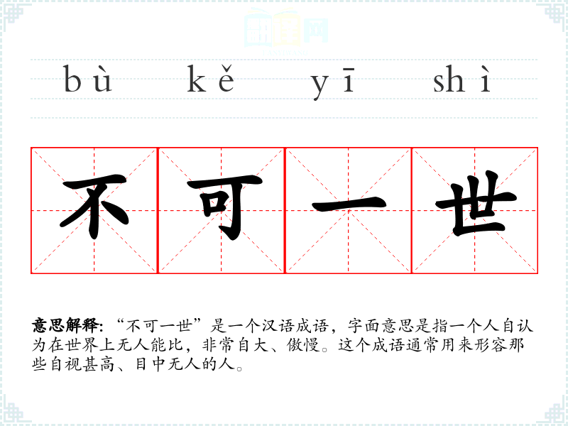 “不可一世”是一个汉语成语,字面意思是指一个人自认为在世界上无人能比,非常自大、傲慢。这个成语通常用来形容那些自视甚高、目中无人的人。