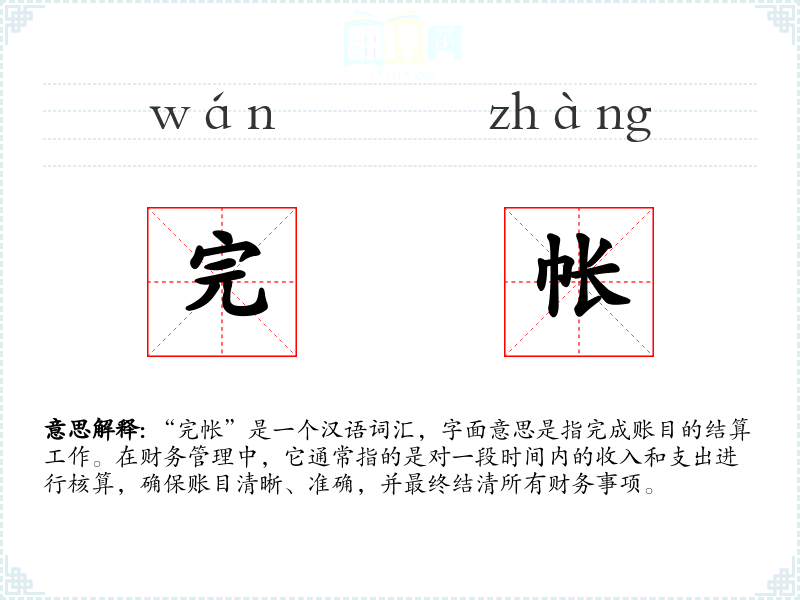 “完帐”一词源于汉语,其中“完”表示完成,“帐”最初指的是账簿或账目。随着时间的推移,“完帐”逐渐成为财务领域的一个常用术语,用于描述账目的最终结算。
