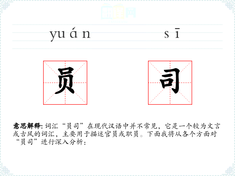 词汇“员司”在现代汉语中并不常见,它是一个较为文言或古风的词汇,主要用于描述官员或职员。下面我将从各个方面对“员司”进行深入分析:
