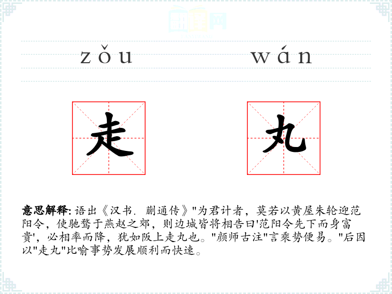 1.语出《汉书.蒯通传》"为君计者,莫若以黄屋朱轮迎范阳令,使驰骛于燕赵之郊,则边城皆将相告曰'范阳令先下而身富贵',必相率而降,犹如阪上走丸也。"颜师古注"言乘势便易。"后因以"走丸"比喻事势发展顺利而快速。