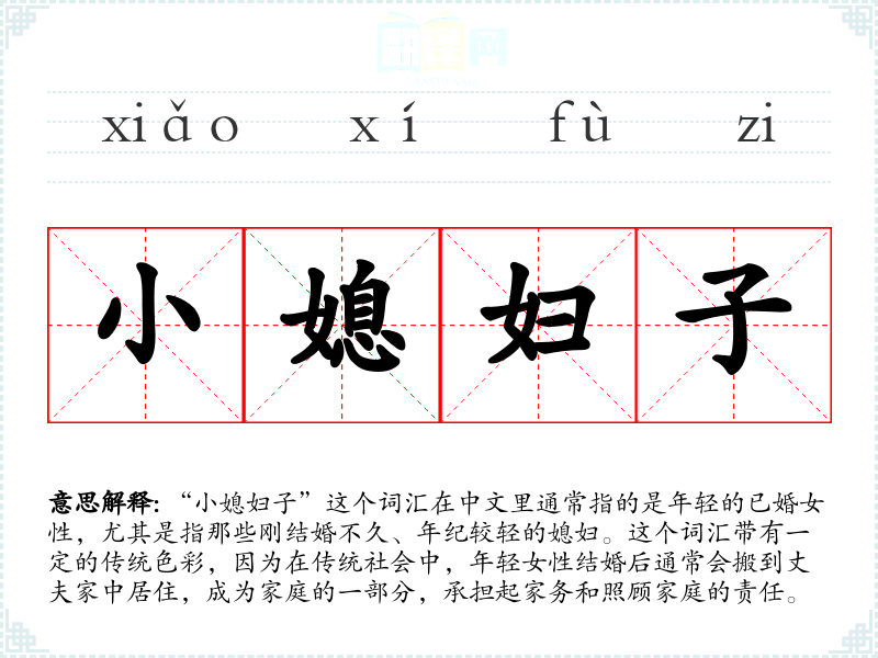 “小媳妇子”这个词汇在中文里通常指的是年轻的已婚女性,尤其是指那些刚结婚不久、年纪较轻的媳妇。这个词汇带有一定的传统色彩,因为在传统社会中,年轻女性结婚后通常会搬到丈夫家中居住,成为家庭的一部分,承担起家务和照顾家庭的责任。