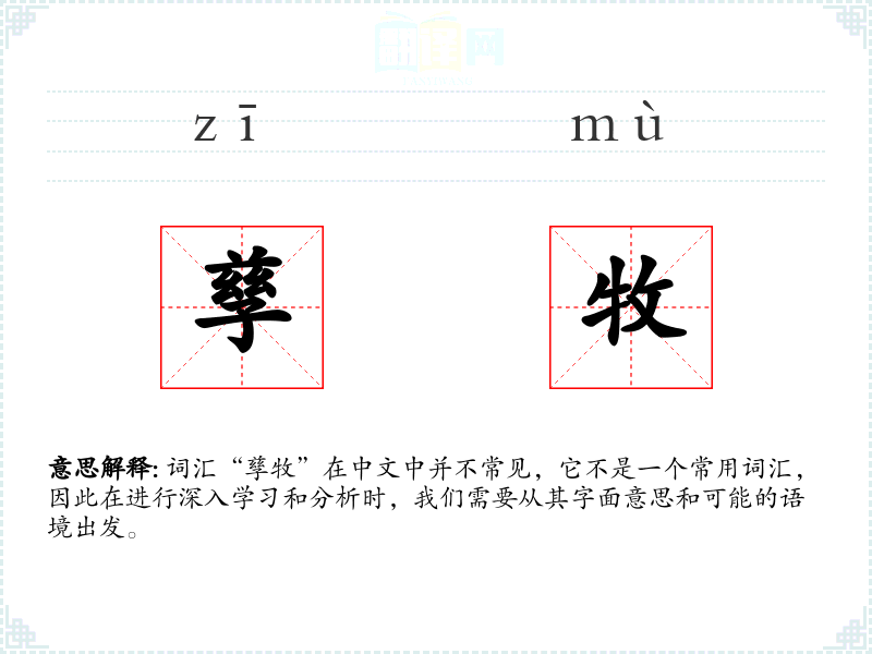词汇“孳牧”在中文中并不常见,它不是一个常用词汇,因此在进行深入学*和分析时,我们需要从其字面意思和可能的语境出发。