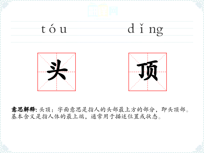 头顶:字面意思是指人的头部最上方的部分,即头顶部。基本含义是指人体的最上端,通常用于描述位置或状态。