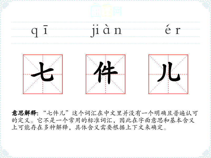 “七件儿”这个词汇在中文里并没有一个明确且普遍认可的定义。它不是一个常用的标准词汇,因此在字面意思和基本含义上可能存在多种解释,具体含义需要根据上下文来确定。