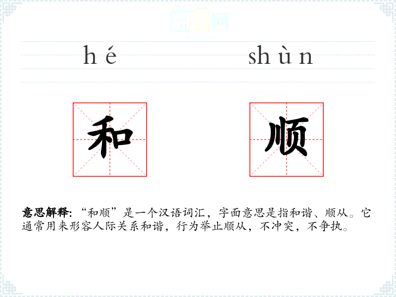 “和顺”是一个汉语词汇,字面意思是指和谐、顺从。它通常用来形容人际关系和谐,行为举止顺从,不冲突,不争执。