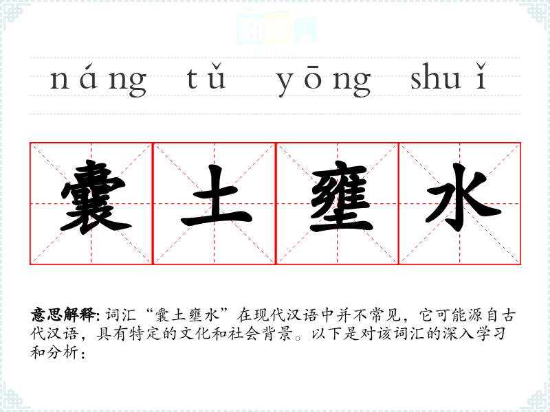 词汇“囊土壅水”在现代汉语中并不常见,它可能源自古代汉语,具有特定的文化和社会背景。以下是对该词汇的深入学*和分析: