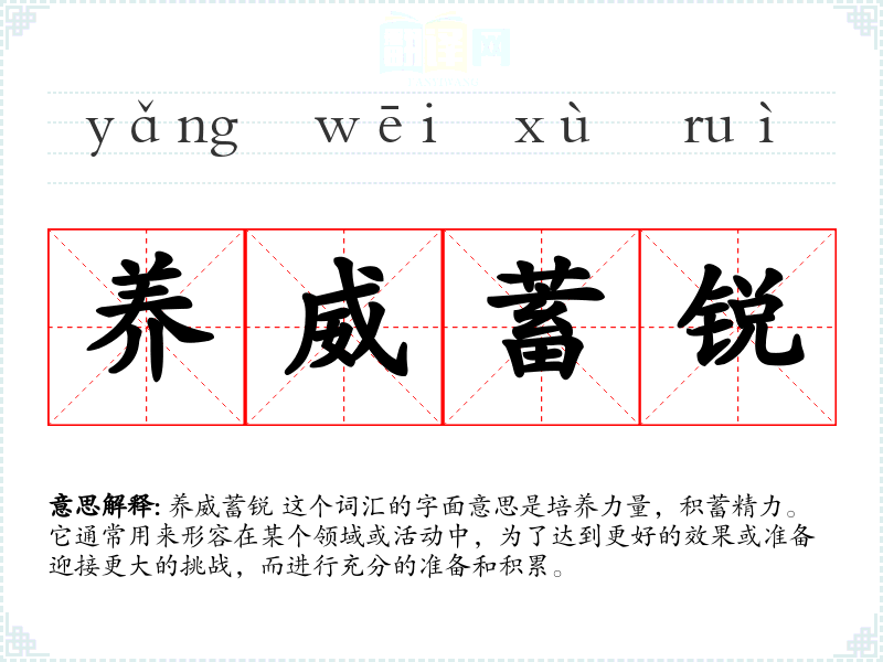 养威蓄锐 这个词汇在语言学和表达中具有重要性,它不仅传达了准备和积累的概念,还鼓励人们在面对挑战时要有充分的准备和信心。通过深入学和分析,我对这个词组有了更全面的理解,并能在不同的语境中灵活运用。