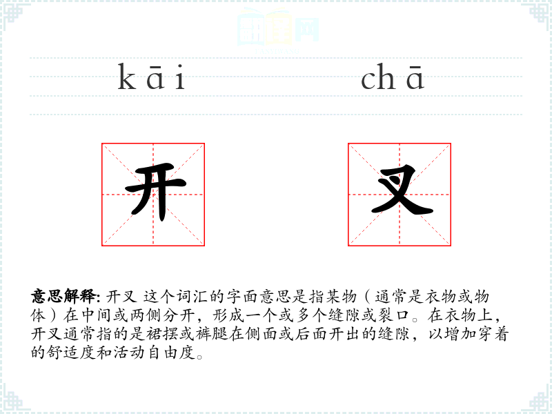 - 口语:在日常口语中,开叉更多指衣物的设计特征,如“这条裙子的侧面开叉很高”。