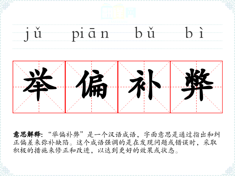 在英语中,类似的表达可能是“correcting mistakes”或“improving flaws”,但这些表达没有“举偏补弊”所蕴含的积极和主动的改进意味。