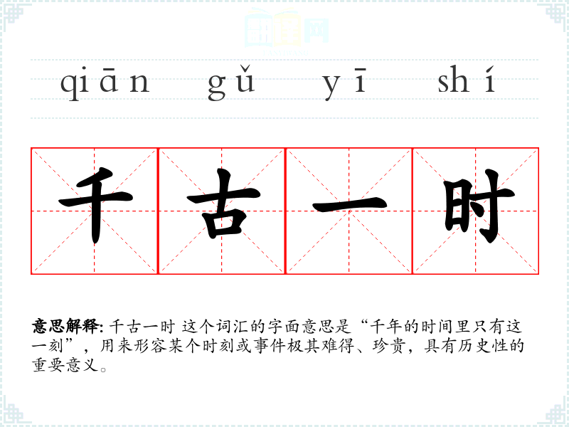 千古一时 这个词汇的字面意思是“千年的时间里只有这一刻”,用来形容某个时刻或**极其难得、珍贵,具有历史性的重要意义。