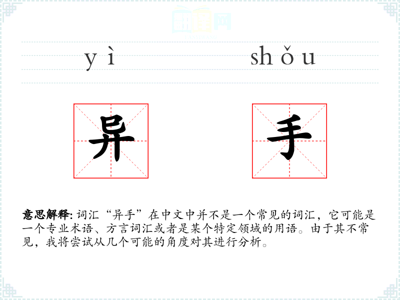 由于“异手”不是一个常用词汇,其词源和演变可能不为人所熟知。它可能是由“异”(不同的)和“手”(手部)两个字组合而成,表示与常规不同的手部操作。
