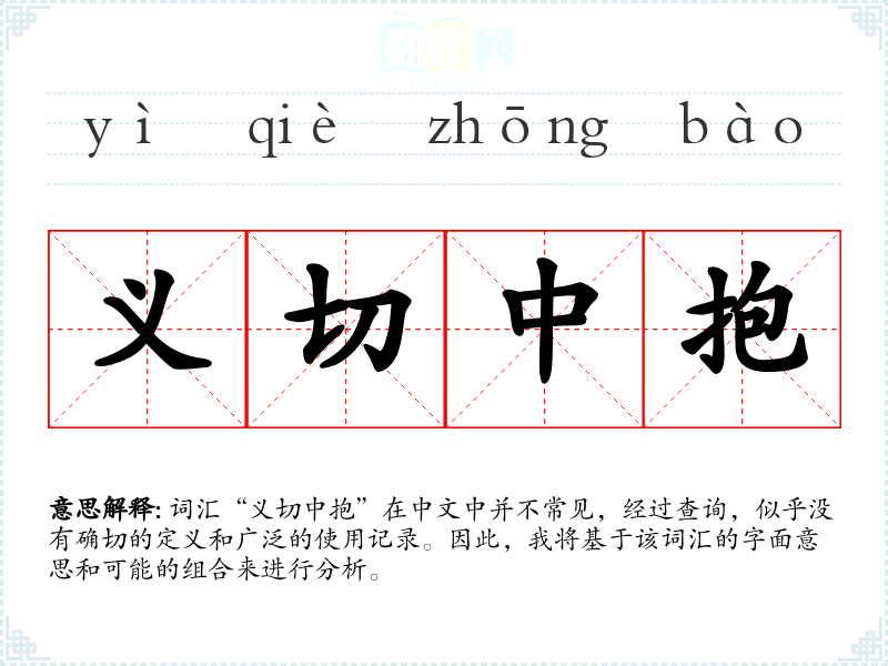 尽管“义切中抱”不是一个标准词汇,通过对其字面意思的分析,我们可以理解它可能传达的坚定和正义的含义。在语言学习和表达中,了解和创造性地使用这样的词汇可以丰富我们的表达方式。