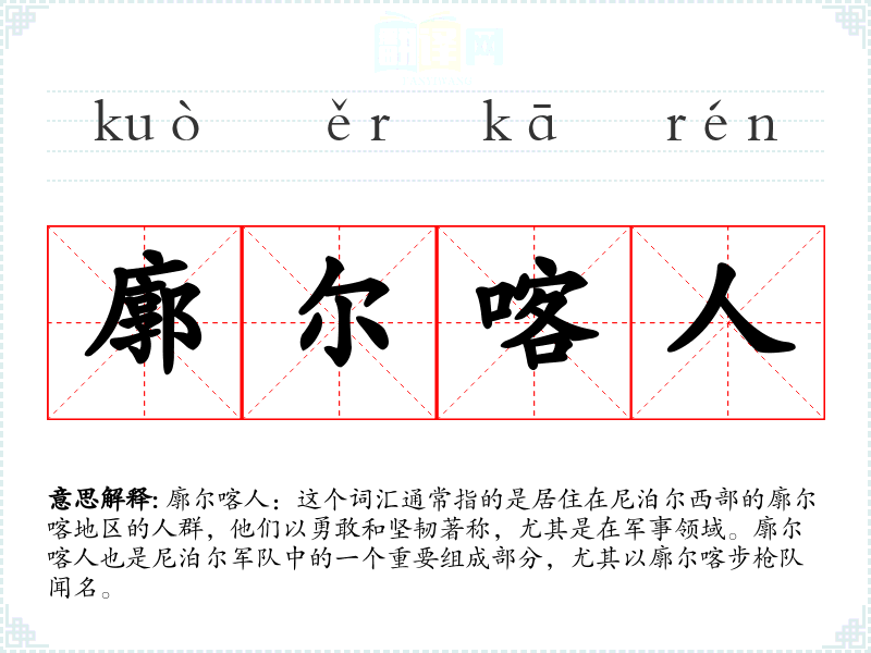 廓尔喀人:这个词汇通常指的是居住在尼泊尔西部的廓尔喀地区的人群,他们以勇敢和坚韧著称,尤其是在军事领域。廓尔喀人也是尼泊尔军队中的一个重要组成部分,尤其以廓尔喀步枪队闻名。
